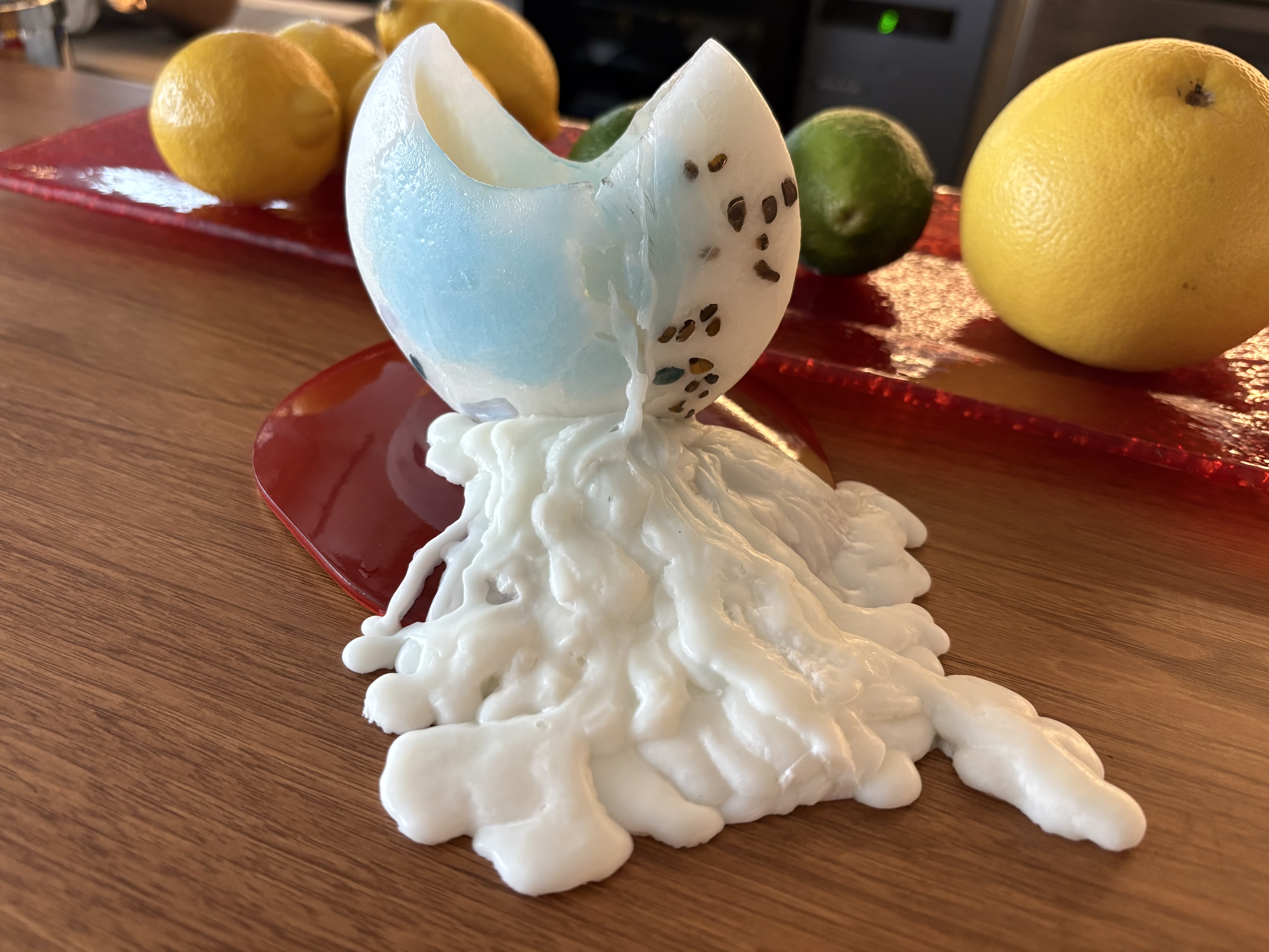 ロウが溶岩のように流れ固まる形は地層のように美しく胡桃のテーブルを覆っていきました